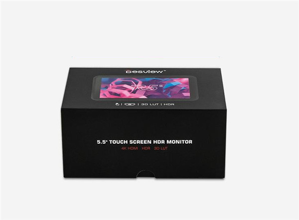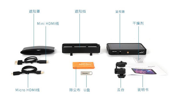 百视悦R5二代包装很简约,黑色的包装盒正面印着监视器的渲染图,以及百视悦的品牌LOGO,打开包装盒内部除了监视器之外,还有一根Micro HDMI高清线、云台、遮阳罩、以及干燥剂。