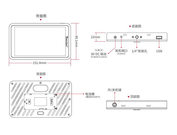 监视器的开关按键在机身上方位置,监视器主要的接口都位于机器左侧,包括一个HDMI输入以及输出接口,一个DC电源输入接口。右侧有散热孔的设计,防止设备长时间使用出现过热的情况。底部有一个8v的输出接口、usb接口和3.5mm的耳机接口。