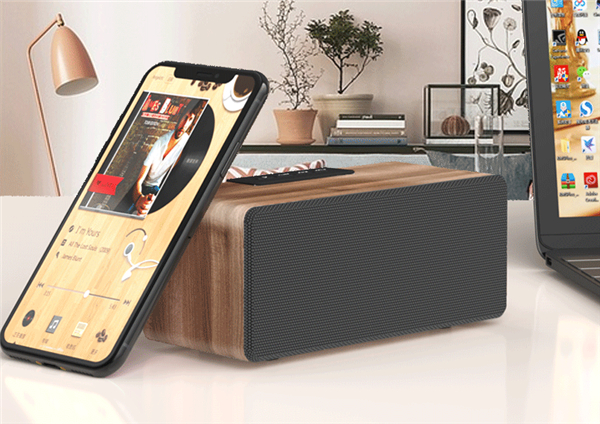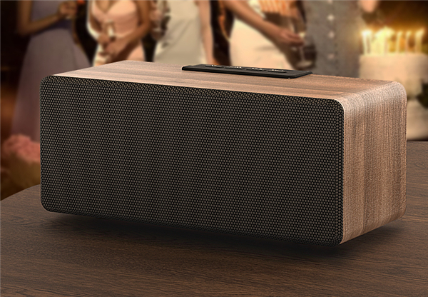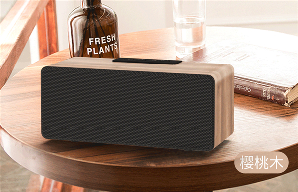 雷登E9人声迷宫无线蓝牙音箱选材设计,它的外壳有两种材料,一种是樱桃木,另一种是胡桃木组成,由于实木分布不均衡,容易开裂和受潮,所以使用的是稳定性更高的樱桃/胡桃实木高密度复合材料或实木皮组成。