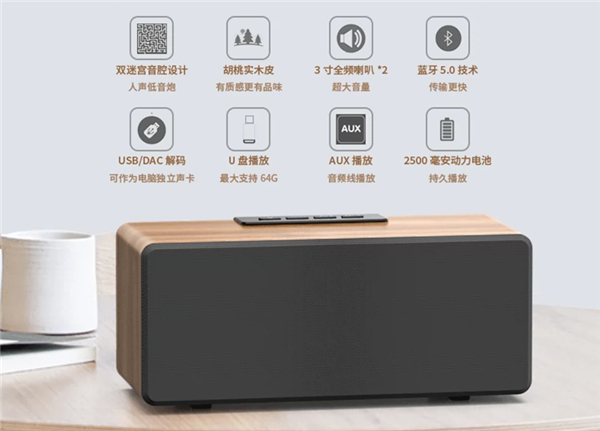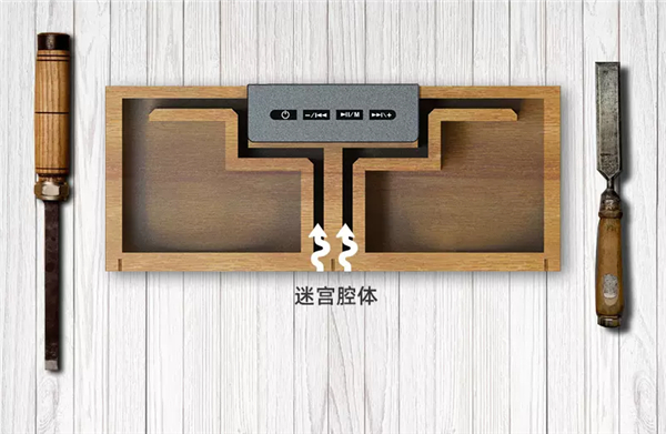 雷登E9人声迷宫无线蓝牙音箱外面覆盖了一层黑色网布,内里采用3寸全频羊毛纸盆,2个功率8W扬声器音量很有爆发力,内置双迷宫音腔设计,迷宫式音箱也叫曲径式音箱或传输线型音箱,由于低音通道很长,能有效提升低频下潜深度,从而提高了音箱声音效果。