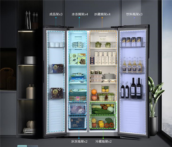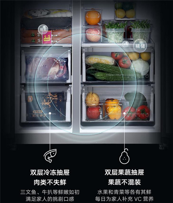 云米AI冰箱Smart Y(对开门603L)的内部空间采用上层搁物架+底层直开抽屉的组合方式,4层高度可调节,搭配2+2直开抽屉,确保生/熟、荤/素、海鲜/肉等不同食材的分类存储,根据个人习惯,不同食材都能找到相对应且合理的存储位置。