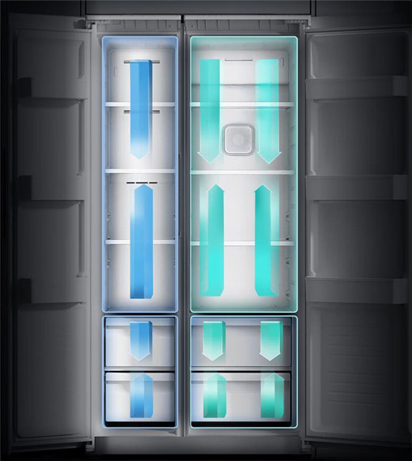 云米AI冰箱Smart Y(对开门603L)Y采用360°立体双循环送风系统,出风均匀,避免直吹风干食物,冷冻食品不粘连,并且制冷快速均匀保持箱内恒温无死角,冰箱内没有了厚厚的霜冻,使用起来省力省电。