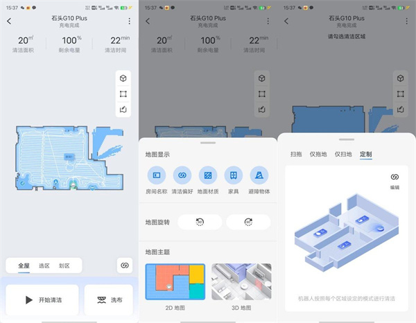 通过LDS高精度建模的能力,石头G10 Plus会以先建图不清扫的模式,完成地图的快速构建,能提供2D与3D地图,用户可以根据不同的地面材质设置不同的清扫方案,让清扫工作变得更有效,也为远程操作提供了便利性。