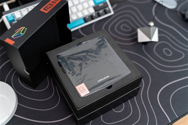 凌珑M的体积可以说是非常的小,整体只有0.6L的体积,长和宽都是116mm,而厚度如果没有贴脚垫是43mm,贴了脚垫是45mm。