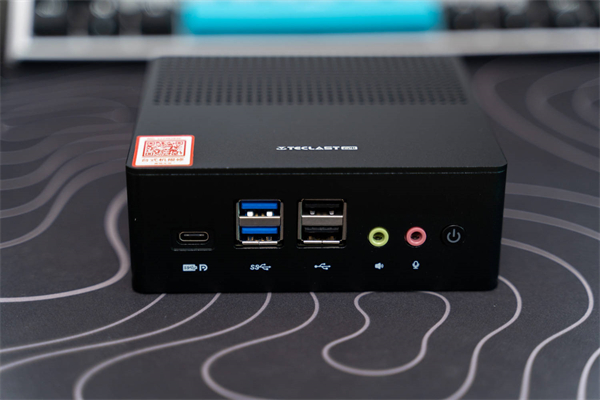 接口方面非常丰富,也是凌珑M的一个特色,正面有一个Type-C接口,支持4K60Hz视频输出,还有两个USB3.0和两个USB2.0接口,两个3.5mm接口,一个是耳机,另一个是麦克风,最后就是电源键。