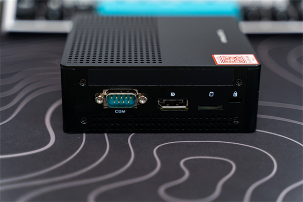 而左侧有一个COM接口,是通讯端口,可以连接一些通信设备,像医院的胃镜、CT,或者超市里的小票打印机等等,所以也是有用的。旁边是DP接口、TF读卡器接口、防盗锁孔。其中DP接口支持4K60Hz视频输出。TF卡口还是很不错的,尤其是我的TF卡还挺多的,有这个方便。