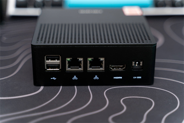 背面也塞满了接口,两个USB2.0,两个2.5G的RJ45网线接口,最高支持4K30Hz的HDMI接口,还有一个12V的电源接口。两个网口,是不是可以软……可以,但是我不会,就先不折腾这个了。