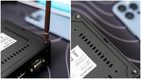 因为是准系统,还是需要安装固态和内存的,所以就得拆,底部4颗螺丝拧开就可以把底板取出,可以注意到一个小细节是开了一个小口,从这里往上一拨就能打开底板。