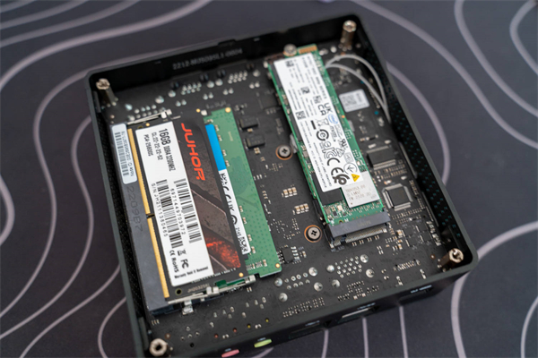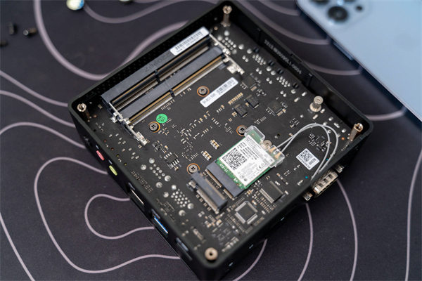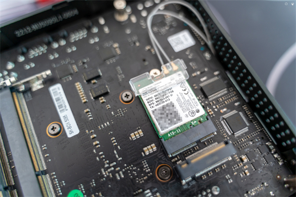 打开就能看到里面,虽然说是准系统实际上安装也是非常简单的,两个内存槽,一个M2接口,还有一张无线网卡,只要把内存和固态怼进去,开机就能用了。