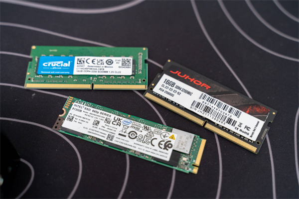这里我弄来了两根16G 3200的内存和intel 660p 500G试机,怼上就完事了,不过要注意的是,内存最大频率支持2933MHz,组双通道才是对核显最大的支持。全部弄完也别先装上地板,先确认机子能正常开机再装回去。