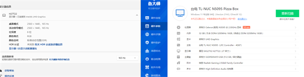 驱动装好之后,可以在刷新率看到165Hz,如丝般顺滑。在鲁大师中可以看到型号台电TL-NUC N5095 Pizza Box,处理器是赛扬N5095,基础频率是2.0GHz,最大睿频是2.9GHz,4核心4线程,性能强,功耗低,所以科技的进步还是有必要的。