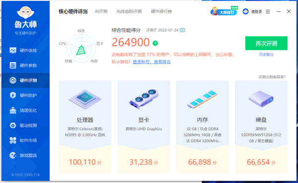 娱乐大师跑分26万,其中处理器跑了10万分,击败了17%的用户,可以流畅的上网聊天、办公炒股、玩小游戏,定位准确。关于内存其实我觉得配两根4G更加合适,为了避免杠精,哪天再撸两根过来。