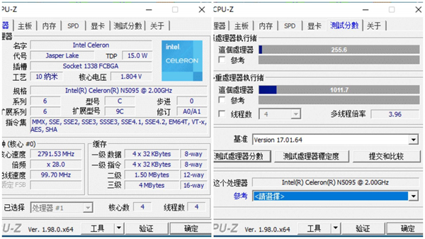 在CPU-Z中可以看到,这个CPU设计的TDP只有15W,intel传统的10纳米++++工艺。测试分数中可以看到单核分数255.6,多核1011.7分。