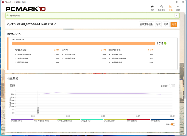 因为可能以办公为主,所以我也跑了一篇PCMARK10,得分1715,常用基本功能是3347分,生产力是2698分,数位内容创作是1519分,仅供参考。