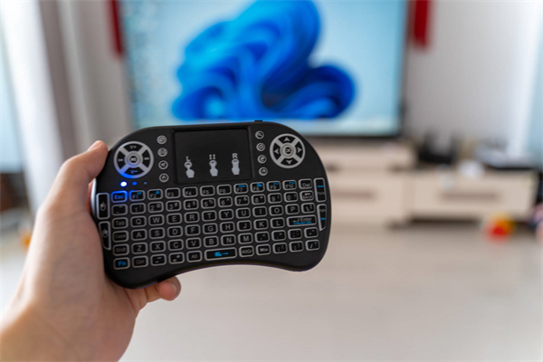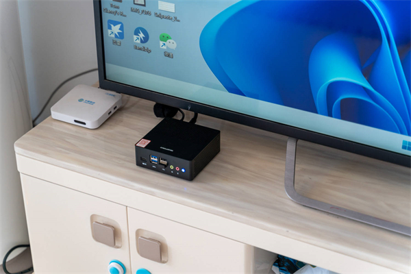 小机子就放在左下角,和电视盒子放在一起,也没比电视盒子大多少,这里要好好使用还得用一个神器,我买了一个蓝牙控制器,支持鼠标也支持键盘,所以电脑接电视控制也没什么大碍。