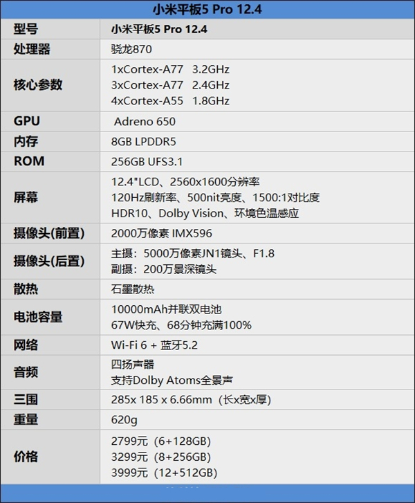 小米平板5 Pro 12.4寸详细配置参数如下: