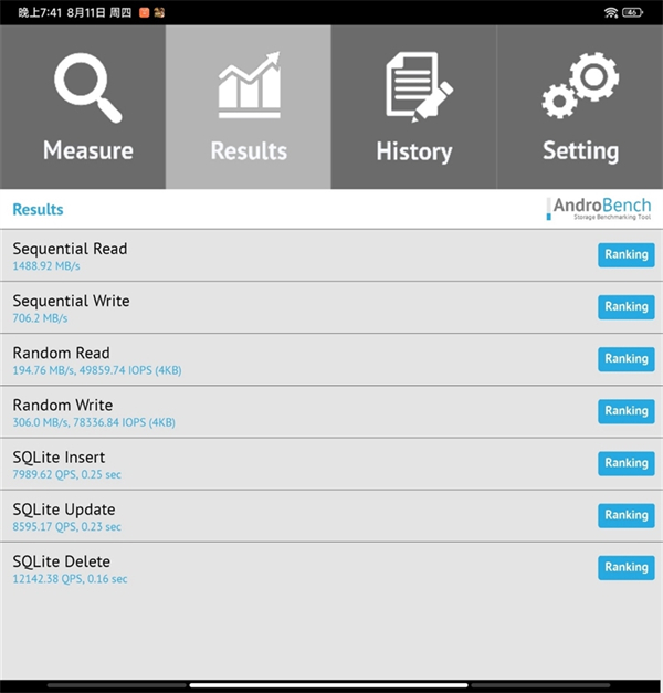 在Androbench测试中,小米平板5 Pro 12.4的顺序读取为1488MB/s, 4K随机读取194MB/s、4K随机写入306MB/s。