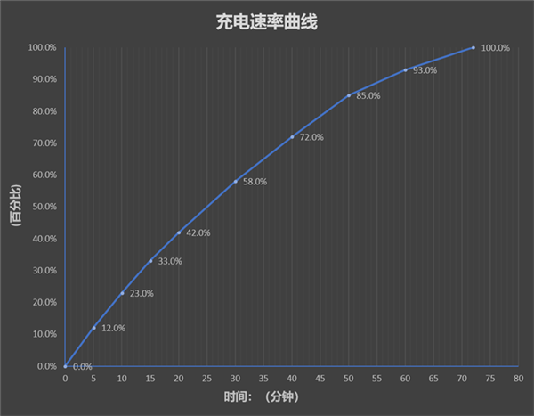 支持67W快充,10分钟充电20%,30分钟时充到了58%,充满100%共耗时72分钟。