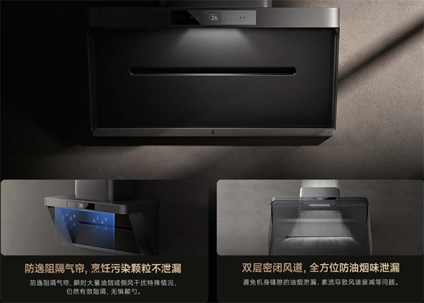 值得一提的是,米家智能净烟机P1还添加了防逸阻隔气帘,在瞬时大量出现油烟或有侧风干扰的特殊情况下,也能有效阻隔。中餐制作过程中的颠勺等操作也不会造成烹饪污染颗粒的泄漏。同时,双层密闭风道可全方面防油烟味泄漏,不仅可以避免机身缝隙中油烟泄漏的问题,还可以解决紊流所导致的风速衰减的问题。让双重保障再加码,有效阻断油烟泄漏的可能,全方位保护我们的健康。