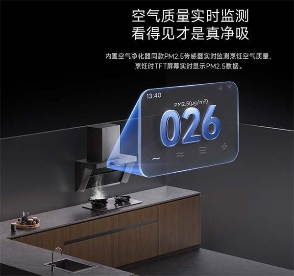 为了用户能更直观的看到油烟机吸收的结果,关注烹饪者的健康,米家智能净烟机P1还运用了实时监测技术,对空气质量进行实时监测。内置空气净化器同款PM2.5传感器,可随时监测烹饪空气质量。烹饪时TFT屏幕会实时显示PM2.5数据,净吸收效果一眼可见。