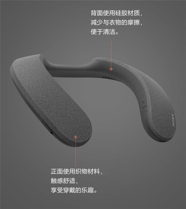 NS7的主体表面主要是由透音织物和亲肤硅胶材质构混合而成。其中透音织物材质主要是覆盖在了上半部,也就是发音单元的位置,这两个发声单元倾斜向上,能带来一定指向性的同时,还具备不错的宽广声场。