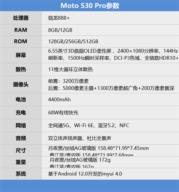moto S30 Pro采用骁龙888+加上Turbo LPDDR5+Turbo UFS 3.1组成的性能铁三角,支持68W快充和4400mAh电池,但依然是轻薄手机,影像方面更是兼具微距影像功能,精准还原色彩和画质,不愧是轻薄手机里的性价比之王。