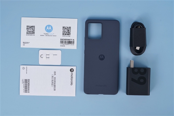 moto S30 Pro手机附赠配件一览,快充适配器、C-C数据线、官方手机壳、电子说明书、保修卡以及SIM卡针一应俱全。