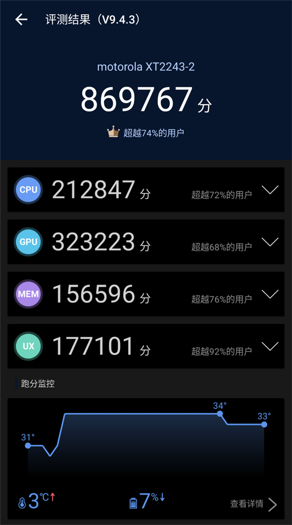 首先是安兔兔综合测试,总成绩达869767分,其中CPU得分212847分,GPU得分323223分,内存得分156596分,UX人机得分177101分。