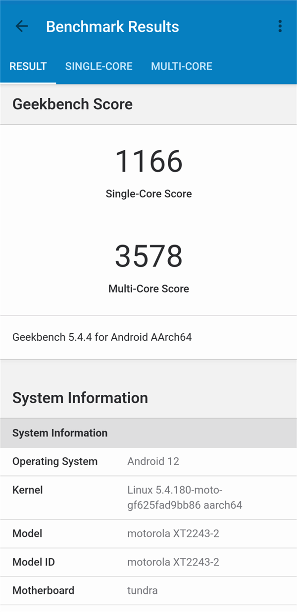 CPU部分,我们选用GeekBench5测试,单核成绩1166.多核成绩3578.与联发科天玑8100相比,单核性能强约20%,多核性能则有些偏弱。