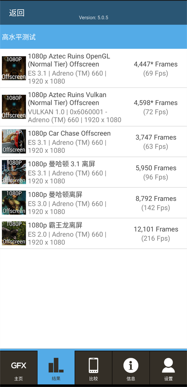 GPU部分,在GFXBench中我们勾选所有1080P六个子项目,跑出的成绩分别为阿兹特克69FPS,废墟OpenGL 72FPS、阿兹特克废墟Vulkan 63FPS、赛车追逐 96FPS、曼哈顿3.1 96FPS、曼哈顿 142FPS、霸王龙216FPS。