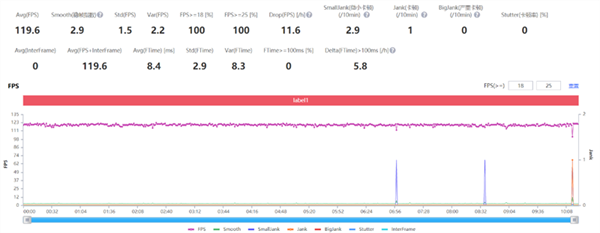 经过测试,《王者荣耀》手游在开启120帧极高帧率+超高分辨率下,经过10分钟的测试,帧率稳如一条直线,全程接近满帧运行,平均帧率维持在119.6FPS。