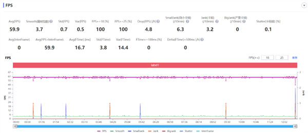 经过近15分钟的测试,帧率表现非常平稳,平均帧率达到59.9FPS,全程满帧运行。