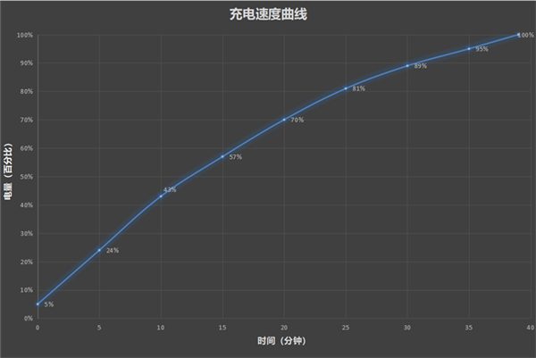 20分钟可充电至70%,30分钟充电至89%,完全充满需要39分钟。
