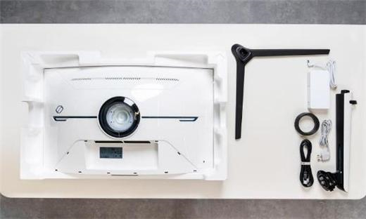 开箱后,可以看到包括显示器屏幕、支架、底座和电源线等各种各样的配件。