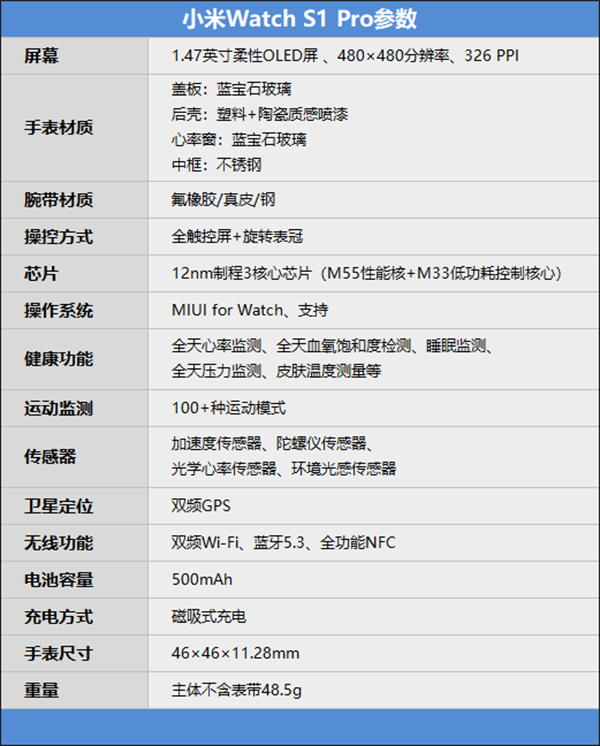 与上代相比,小米Watch S1 Pro的柔性屏幕减薄了0.3mm,也让小米Watch S1 Pro在表体大小不变的情况下,还有更先进的封装工艺加持下,边框收窄了18%,轻松实现了72.7%的屏占比,电池也更大了一些,从上代的470mAh提升到500mAh。