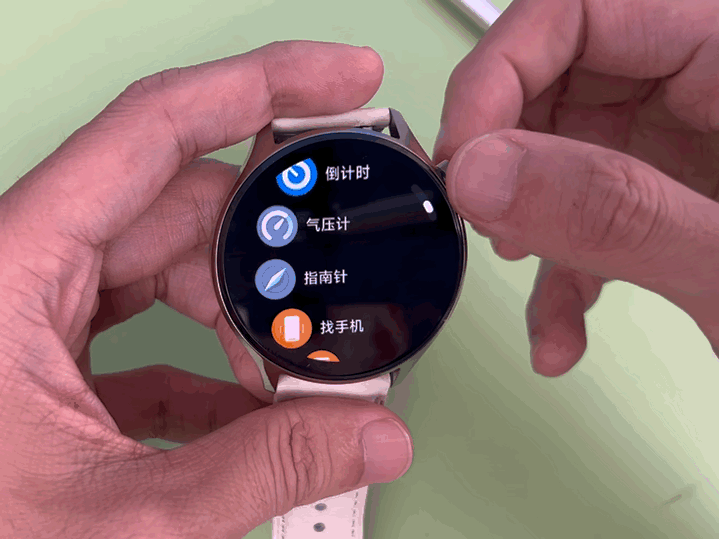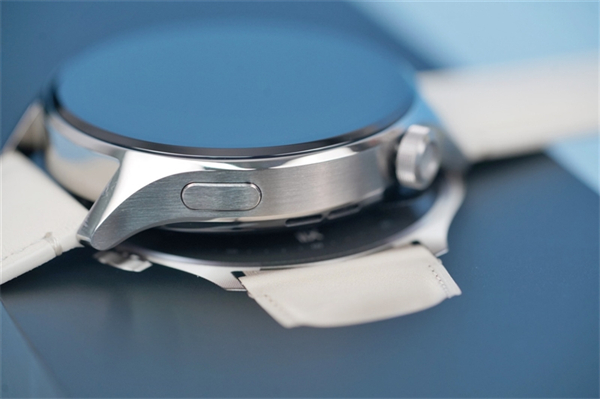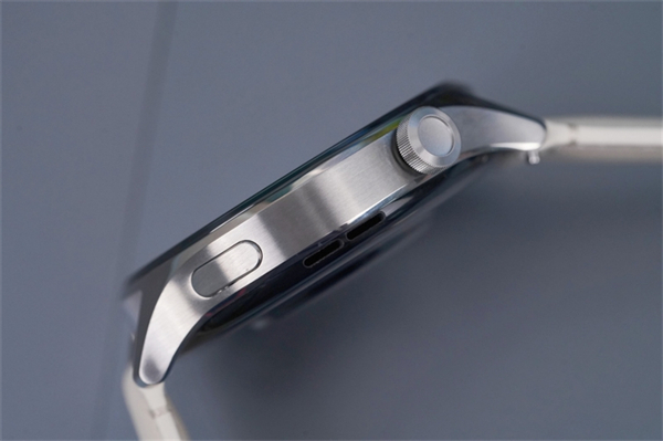 上方的金字塔纹旋转表冠(图中右边的按钮),轻按可以实现返回、切换主页,长按呼出语音助手操作,并且无需手动触摸屏幕也可以旋转实现滚动操作,比如菜单选择、阅读长信息这样的场景时,就非常实用,再结合Z轴线性马达,振动反馈非常细腻