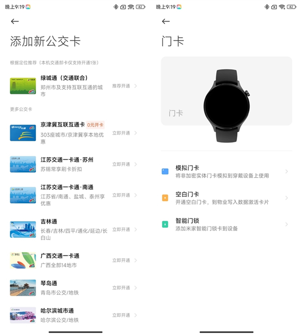 小米Watch S1 Watch和代一样,也支持全功能NFC,如果有刷公交和门禁的需求,可以在“小米运动健康”App内“卡包”页面开启对应的服务。