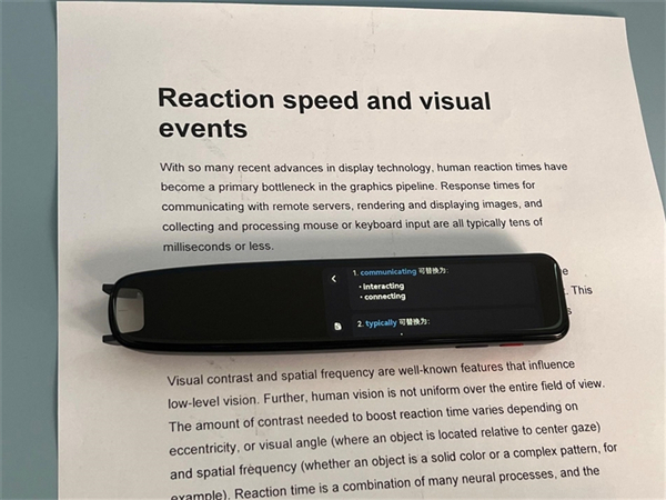 有道词典笔X5搭载的OCR(光学字符识别技术)技术有道自研开发的,搭配同样自研的AI技术YNMT(神经网络翻译),在线翻译水平堪比英语专业八级,手写和打印字体都能准确识别。