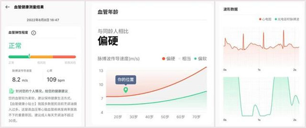 表冠旁是一个侧方电极,目前可以支持血管弹性程度的检测。佩戴时,用一只手指按住电极30秒即可检测血管弹性程度,并生成同龄人评估报告与健康建议,辅助用户和家人及早发现血管硬化风险。