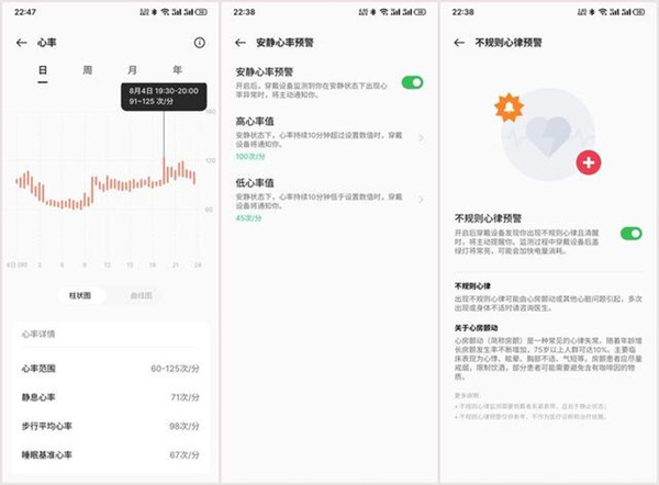 OPPO Watch 3 Pro支持24H全天候心率监测和不规则心律监测,心率过低、过高时,或者出现不规则心律时候都能够及时发出预警提醒。据官方介绍,其心律监测功能与武汉亚洲心脏病医院心内科心律筛查结果对比下,阳性准确率达到了98.26%。