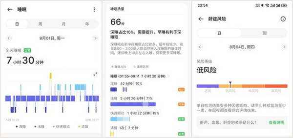 睡眠监测方面,OPPO Watch 3 Pro针对越来越年轻化的鼾症问题进行了重点升级。鼾症风险评估2.0新增“睡眠呼吸率”参数,可以直观反馈睡眠呼吸状况;鼾症风险评估算法也融合了血氧、心率变异性(HRV)、鼾声、睡眠基准心率、体动、呼吸、个人信息等数据评估睡眠中呼吸问题。