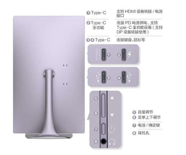 显示器是内置扬声器的,位于显示器的正中间底部密密麻麻的小孔位置就是,难怪会配备3.5mm耳机孔。从我个人的使用角度来看,如果机身背面有USB-A口会比较好,毕竟很多型号较老的主机并未配备Type-C口,当然也可以靠第三方拓展坞来解决这个问题。