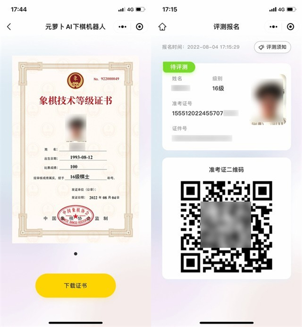 除了基础教学外,“元萝卜SenseRobot”AI下棋机器人还拥有国家体育总局中国象棋协会权威认证,支持16-13级象棋等级评测。你足不出户就能完成官方象棋等级考核中16-13级的等级评测,成功通过等级评级后还可拥有中国象棋协会颁发的等级证书哦!