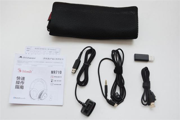 迫不及待打开包装盒,主包装清单包括双飞燕MR710无线游戏耳机,操作说明书(三包凭证和质保卡)、type规格的充电线、、抗干扰延长底座、type转3.5mm接口的音频线、2.4G无线传输适配器,还配备了一个便携收纳袋等,考虑的十分周到全面,考虑了用户使用、携带的各种场景,不仅不用担心运输途中的磕碰问题,而且看起来也是非常高大上。