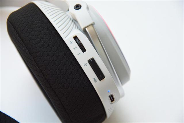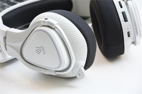 耳罩外侧便是灰色机身,其中右耳外侧的下方位置,双飞燕MR710无线游戏耳机设计了音量加减调控键、电源开关键、语音开关键、Type-C接口,基本上该功能按键都集中在这一边,正好习惯用户右手操作。