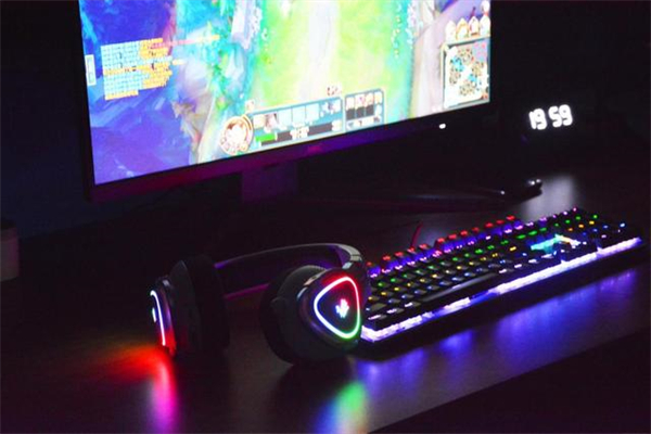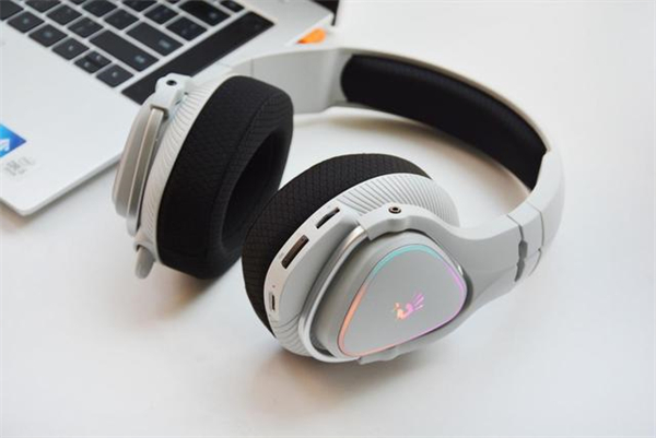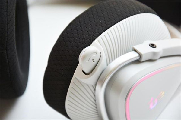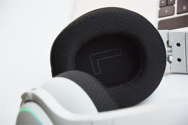 左右耳罩的外侧面是类似耳朵形状的圆润三角形,非常亮眼的是周围还有一圈彩色的RGB灯效,中间是品牌Logo彩色灯效,点亮之后看起来颇为炫酷。尤其是再配上有灯效的机械键盘,这把游戏氛围相互映衬的十分到位,玩家们最爱。