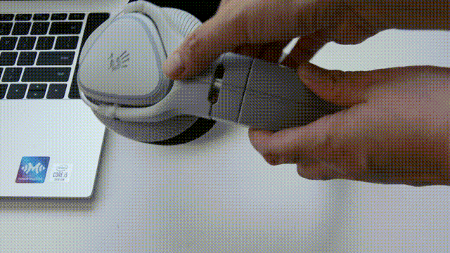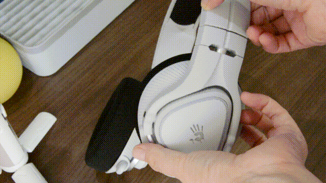 耳罩这里还可以90度旋转,这个旋转倒不是说提供不同的佩戴姿势,主要是两只耳罩旋转之后,与头梁转换成一个平面上,这就方便双飞燕MR710无线游戏耳机扁平化折叠更容易收纳携带。