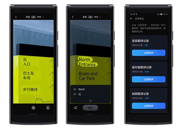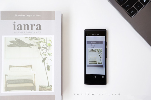 在设计交互上,讯飞翻译机4.0在机身侧面设计了电源键和音量调节键,和目前市面上的智能手机操作类似,几乎没有学习成本,上手很容易。机身背面还设计了一颗摄像头,方便对一些杂志、路牌、标语等进行拍照翻译。