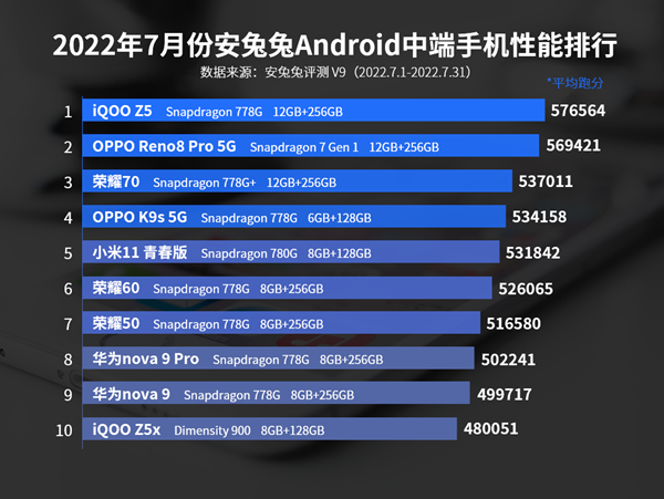 具体的排名方面,️前三的机子分别为iQOO Z5、OPPO Reno8 Pro和荣耀70.综合跑分分别为576564、569421、537011.