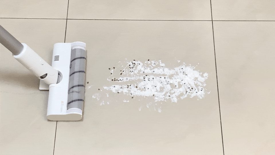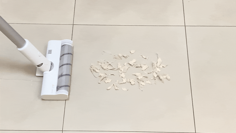 软绒刷头因为重力设计缘故,所以抓地能力很强,加上采用软硬尼龙毛设计,清洁效果真的十分出色。咱们接下来就以碎纸屑、面粉、绿豆等杂物来测试一下。